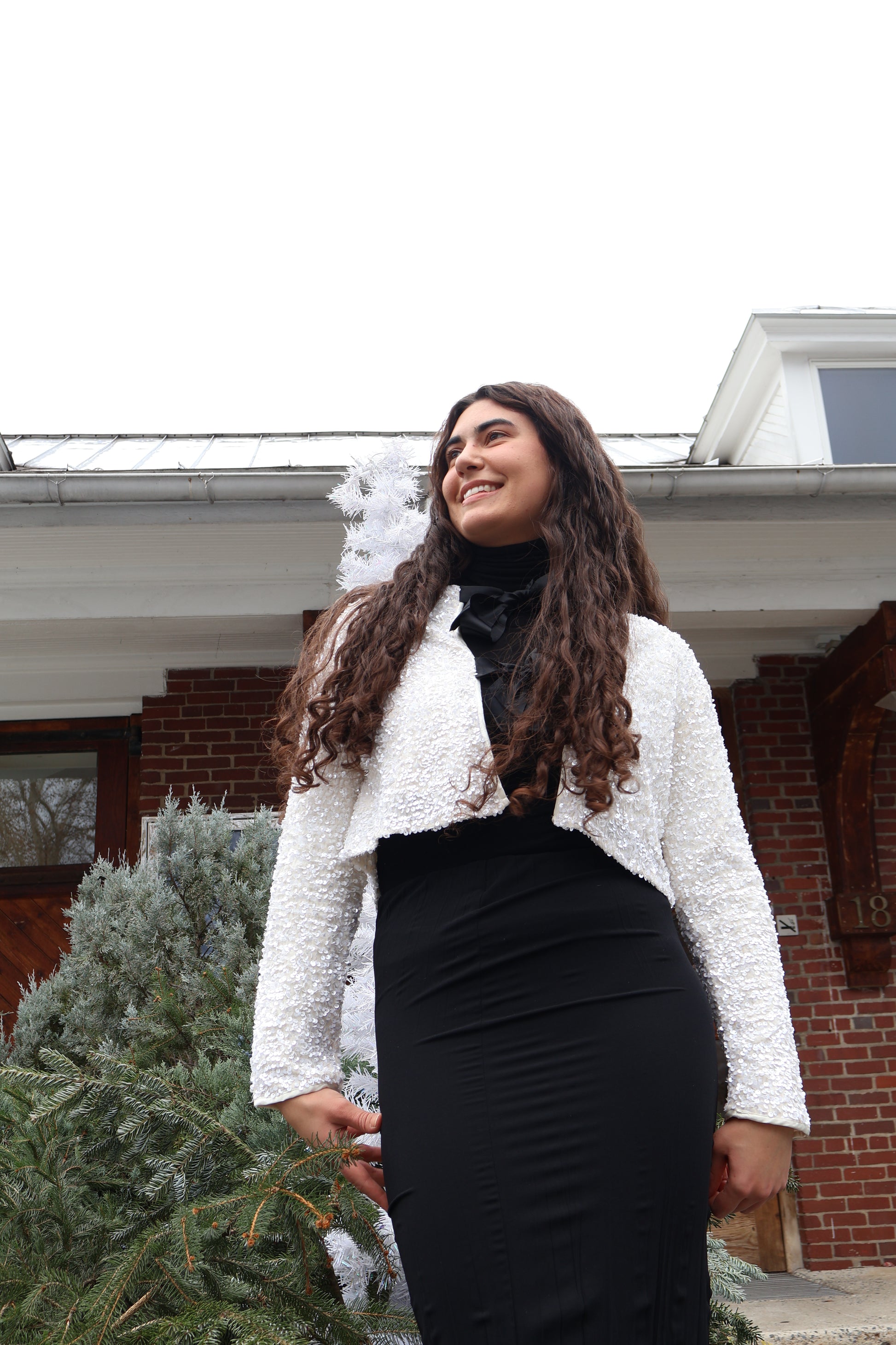 This cropped jacket features an allover sequin embellished body with a boxy silhouette, long sleeves and striking black ribbon ties at the front for a chic contrast finish.
